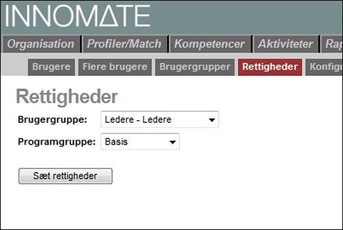 Rettigheder tildeles brugergruppen i forhold til forskellige programgrupper/"faneblade".