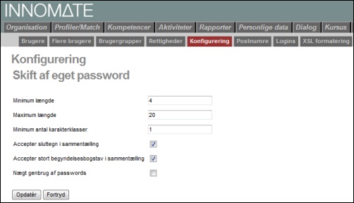 Passwordpolitikken fastlægges efter følgende kriterier:
