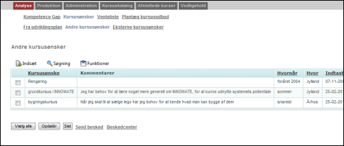 Siden indeholder interne kursusønsker, der kan være afgivet af medarbejdere via mappen Personlige data > Kursusønsker og/eller gennem en intranetformular. Intranetformularen kommunikerer med INNOMATE HR Kursus gennem en Web Service.
