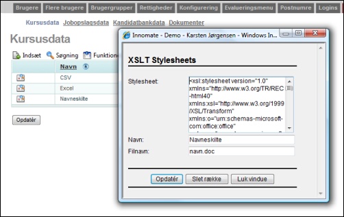 Stylesheet: XSL-koden kopieres ind i feltet.