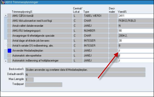 Derefter (rækkefølgen er vigtig) skal man på vinduet A910 Trimmeoplysninger fremsøge trimmeoplysningen Anvender Medarbejderplan og her angive J.